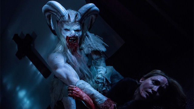 Something that was brought up during the discussion is the coincidence of Michael Dougherty (Trick ‘r Treat) directing his own Christmas horror film Krampus. “We were a little nervous for a while, until we started seeing some of the imagery,” says Hoban. “Fortunately his Krampus looks more like the original Krampus. Hes more of a traditional Krampus, while ours is a more unexpected Krampus.” Hoban elaborates that the Krampus in A Christmas Horror Story was designed to resemble a Nordic demon and be the antitheses of Santa Claus, with the Krampus being white with some red, to contrast with Santa being red with some white.